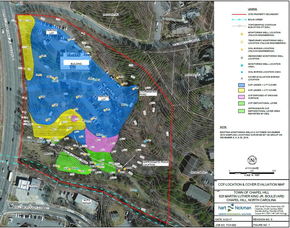 July 13, 2017 – N.C. DEQ informs Chapel Hill that its latest report incorrectly claims there is no coal ash south of the Bolin Creek trail. DEQ points out that coal ash that has washed down from the dump site is located on both sides of the trail and that soil samples along the greenway found "elevated levels of arsenic" and other pollutants.